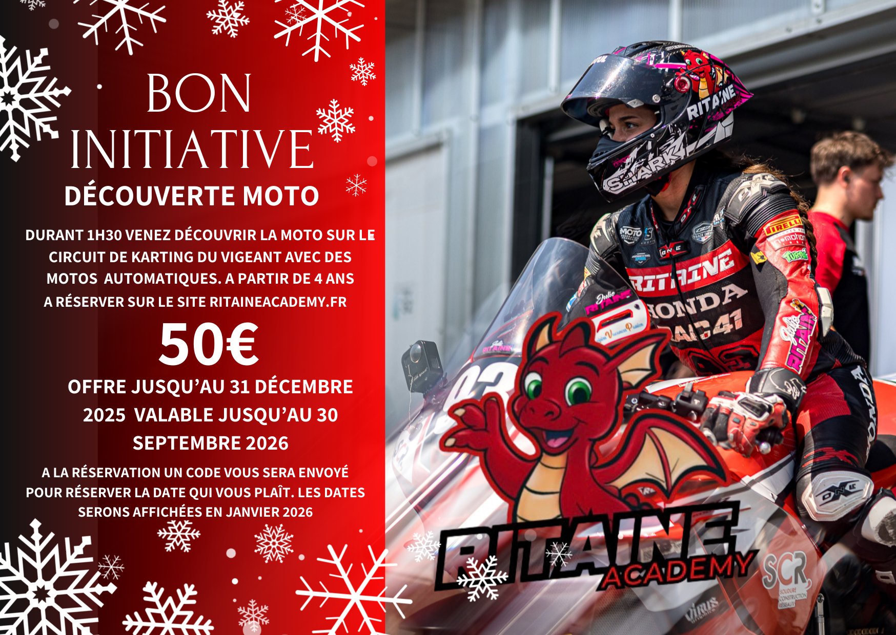 - DURANT 1H30 VENEZ DÉCOUVRIR LA MOTO SUR LE CIRCUIT DE KARTING DU VIGEANT AVEC DES MOTOS AUTOMATIQUES. A PARTIR DE 4 ANS. Offre jusqu’au 31 Décembre 2025 valable jusqu’au 30 septembre 2026. A la réservation un code vous sera envoyé pour réserver la date qui vous plaît. Les dates serons affichées en janvier 2026